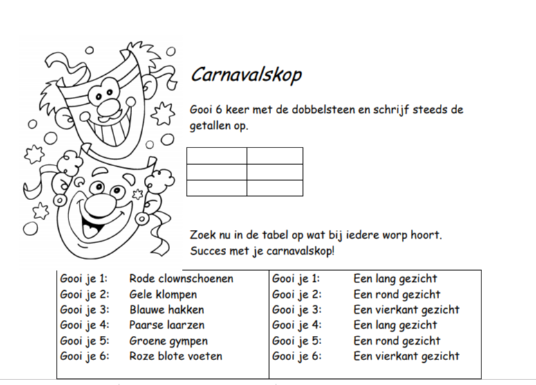 Ik had een carnavalsactiviteit voorbereid, dus van te voren had ik al wat spullen klaargezet. De activiteit hield in dat leerlingen een carnavalshoofd gingen knutselen. Doormiddel van een dobbelsteen konden de leerlingen zien hoe hun carnavalshoofd eruit moest komen te zien. In groepjes gingen leerlingen aan de slag. Omdat ze allen iets anders hadden gegooid met de dobbelstenen, werd hun carnavalshoofd ook anders. Dit zag er heel creatief uit en leerlingen waren erg enthousiast.