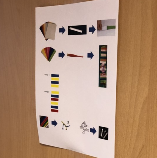 De weektaak was een sjaal maken door middel van stukjes papier scheuren en knoopjes maken. Bij deze weektaak had ik een stappenplan gemaakt, zodat de kinderen weten welke stapjes ze moeten zetten. Bij de weektaak zijn de kinderen motorisch bezig met knippen, plakken, scheuren, kleuren en knopen. Maar ook waren ze bezig met rekenen, dit door middel van reeksen maken. Hierbij moest groep 1 van twee kleuren een reeks maken en groep 2 van drie kleuren.