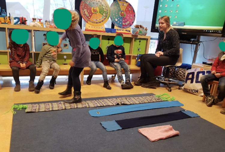 Bij de rekenactiviteit in de kring had ik ook rekening gehouden met de belevingswereld van de kinderen. Ik had zelf sjaals meegenomen en ik liet de kinderen een sjaal pakken wie die bij zich had. Met die sjaals gingen we meten. Ik heb daarbij vragen gesteld zoals: Denk je dat je een lange of korte sjaal hebt? Welke is langer/korter? Kan je ze van lang naar kort leggen? De kinderen waren erg betrokken en we hebben woorden geleerd zoals: breed/smal en lang/kort. Als laatst heb ik de kinderen nog gemeten bij de muur, waar ik ze op het begin van het jaar ook al heb gemeten. Zo konden de kinderen zien of ze zijn gegroeid dit jaar.